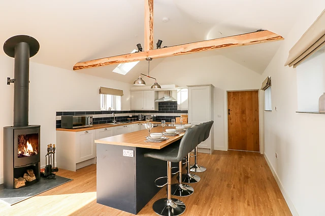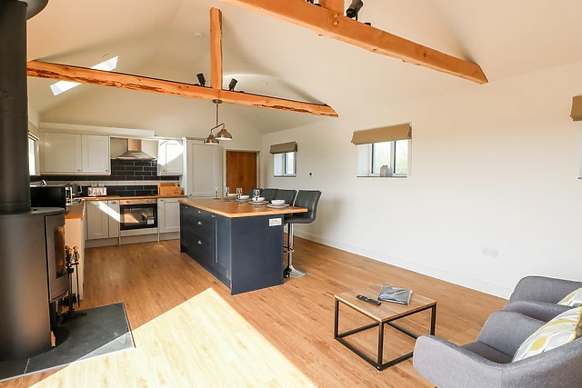 The open-plan kitchen and dining area, complete with a woodburning stove, offers a warm welcome, while the mezzanine sitting room with a balcony provides stunning views of the Welsh landscape.