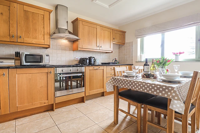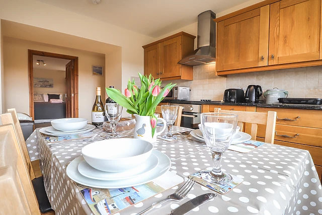 The fully-equipped kitchen and dining area are ideal for home-cooked meals, creating the perfect setting for a memorable cottage break.