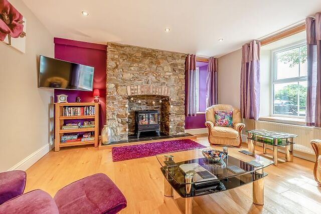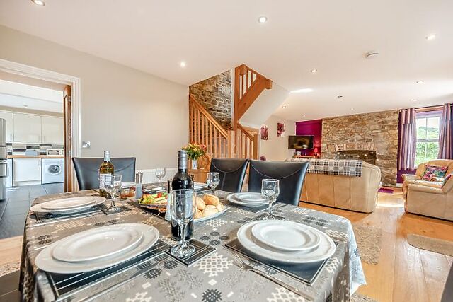 Gwynnant House in New Quay, West Wales, is a delightful stone cottage that sleeps five people. This two-bedroom accommodation offers a perfect mix of modern comfort and traditional features. The open-plan living and dining area is spacious and filled with natural light, featuring a leather suite, a SMART TV, and an electric fire set in a beautiful stone fireplace.