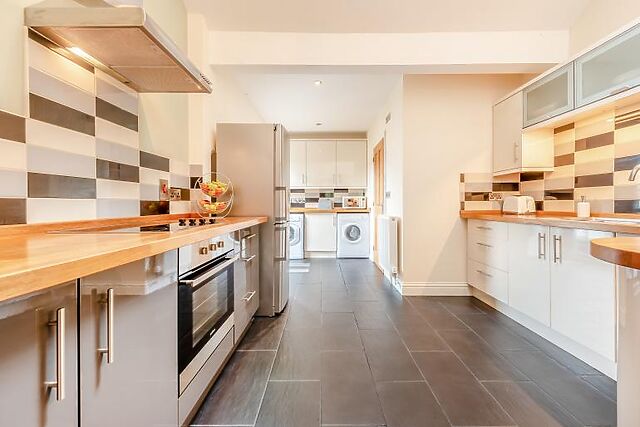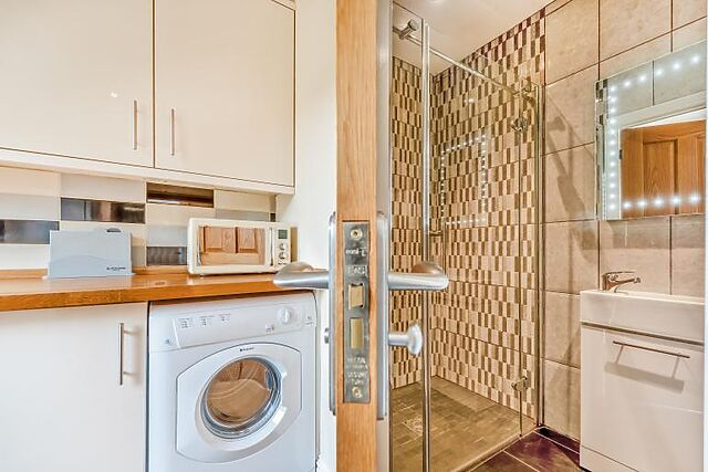 Outside, the enclosed lawn garden is perfect for outdoor dining with its garden furniture, BBQ, fire pit, and solar lights.