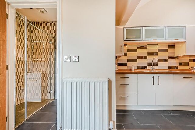 The kitchen is stylish and well-equipped, sharing a tiled floor with the utility room, which also has a shower room. Upstairs, there are two king-size bedrooms, one of which can be converted into twin beds upon request.