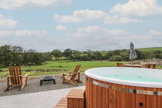 The bedroom features a rustic and charming four-poster bed, feel fluffy rug beneath your toes as you enjoy a cup of coffee with a view. In the morning enjoy some fresh air as bird song fills the air, dine alfresco as you plan the adventures ahead, or hear the logs crackle as you take a dip in the large wood-fired hot tub perfectly positioned to admire the view.