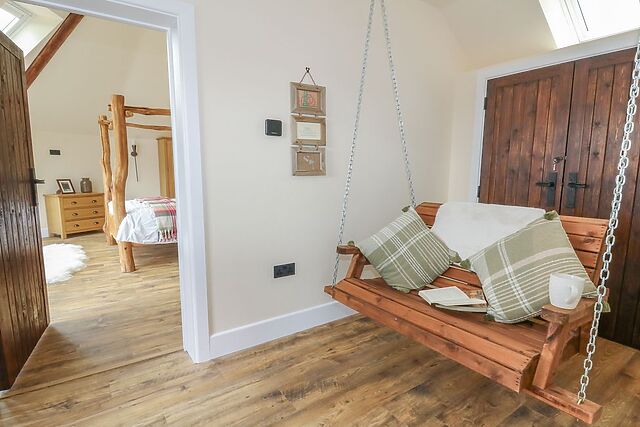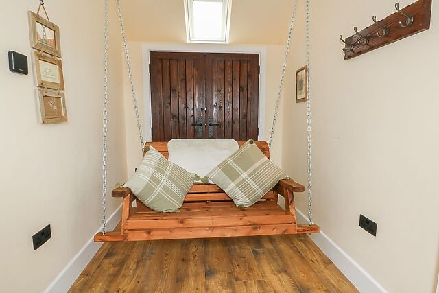 Enter to the hallway and pause at the swing seat, ideal for slipping your shoes off, reading a book, taking in the views or commemorating the moment with a picture. Walk across the warm toned wooden flooring to the open-plan living space, housing a well appointed kitchen, dining area and sitting area.