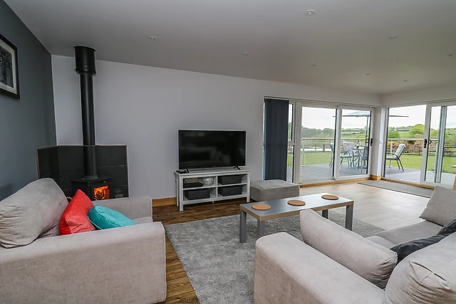 The modern open-plan living space, complete with a woodburning stove, invites you to unwind and relish the captivating views of the adjacent fishing lake.