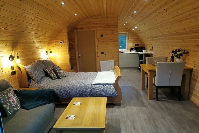Inside, the open-plan layout brings together the double bed, dining area, and sitting space, allowing you to settle in with ease. The kitchen is neatly arranged with the essentials for preparing meals after days spent exploring the surrounding landscapes.