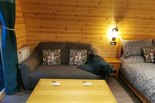 Lodge 2 is a welcoming rustic lodge positioned near Pontyates, Carmarthenshire, offering a studio-style living space and a private garden with a hot tub. The wooden walls create a natural, warm backdrop, giving the lodge a gentle character that suits couples or solo travellers seeking a simple countryside retreat with their dogs.