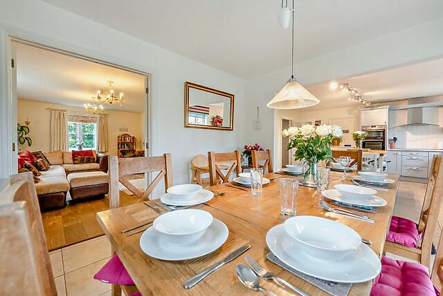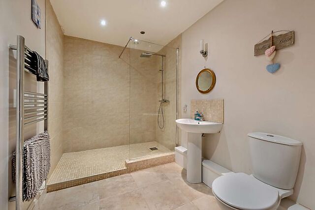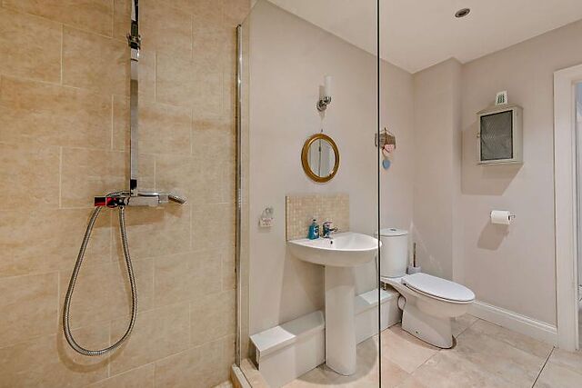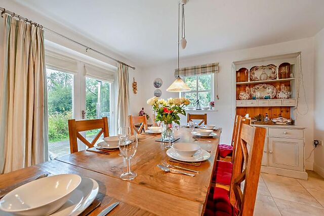 The dining area is perfect for gathering around the table for meals or board games. A double bedroom and a separate shower room are conveniently located on the ground floor.