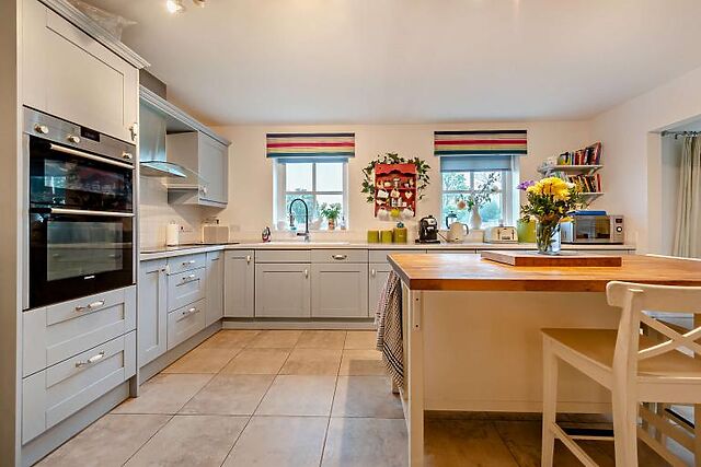 The lounge is comfortably furnished with a Smart TV and a cosy wood burner for those cooler evenings. The open-plan kitchen/diner features a kitchen island, ideal for socialising while cooking.