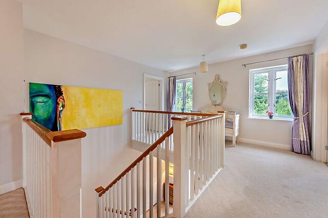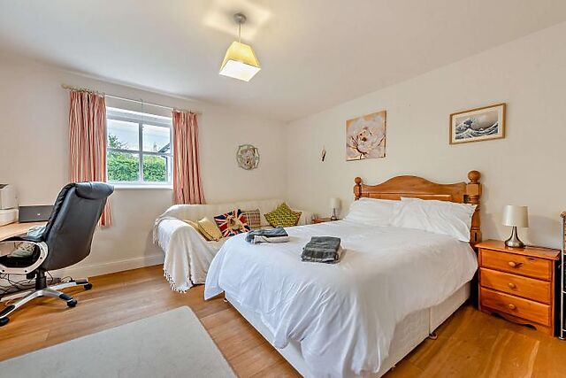 Upstairs, the master suite boasts a king-size bed and an en-suite bathroom.