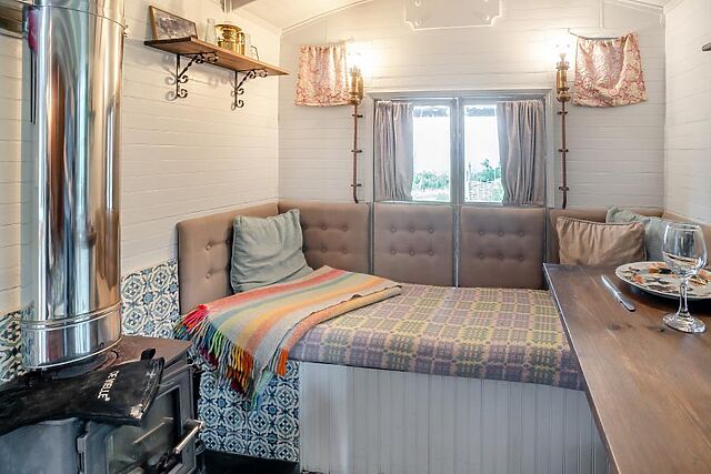 Climb five steps to enter the lovely caravan and discover a delightful interior, with a curved wooden ceiling, a beautiful bed and special, decorative, vintage touches. Light the wood burner in here after rural walks to create a cosy ambience.