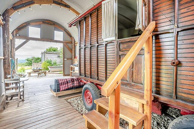A delightful, retro hideaway, nestled in the glorious Ceredigion countryside, this former horse-drawn caravan, restored to its former glory, is a truly special romantic retreat for couples. Tucked away inside a rustic Dutch barn, to ensure you have fun whatever the weather.