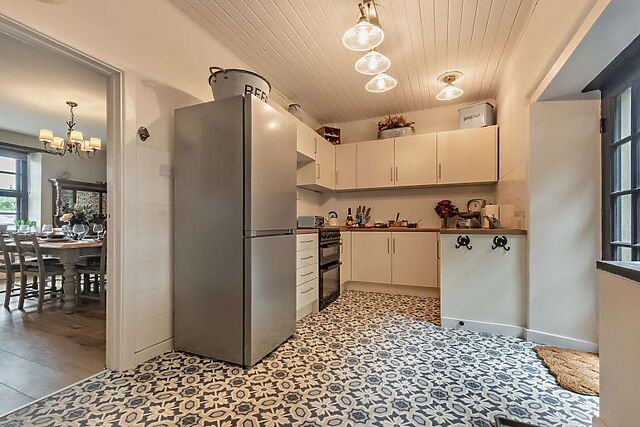 Discover a welcoming ambience in the dining room opposite, a place with a wood burner effect electric fire. Any meals can be prepared in the kitchen and served up either by the cosy fire or out in the endless lawned garden with plenty of outdoor furniture.