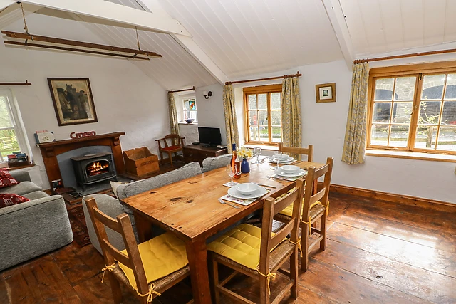All the buildings, including the cottage, are Grade 2 listed. In the cottage there is an open-plan kitchen and sitting-room with wooden flooring, a fully equipped kitchen with a large farmhouse table and two comfortable sofas for relaxing in front of the wood-burning stove.