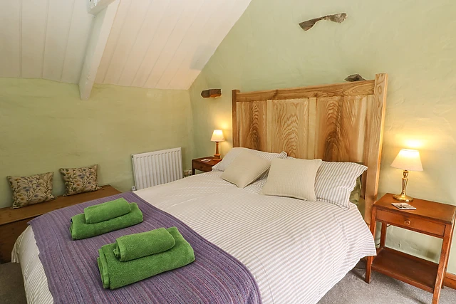 Much of the furniture and fittings have been made by the owners from timber harvested from the woods on the farm. There are two bedrooms, each with hand-made wooden beds, one king-size and one single, made up with luxurious goose-down duvets and locally made Welsh wool coverlets.
