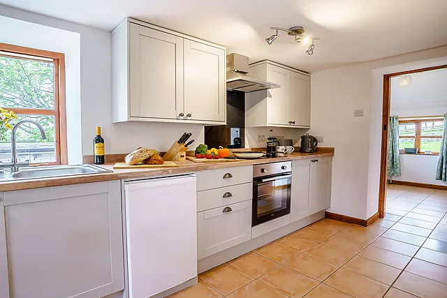 The cottage features two well-equipped kitchen areas, each with an electric oven and hob, microwave, fridge, toaster, and dishwasher. There are also two utility rooms with freezers and washing machines, catering to all your culinary needs.