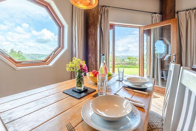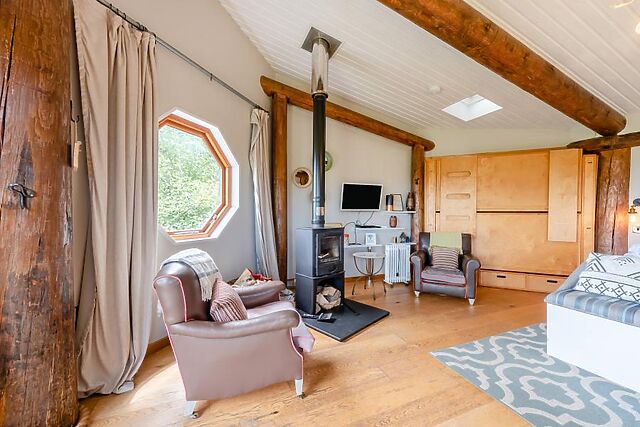 Find yourselves in an open-plan lounge/kitchen/diner/bedroom cleverly designed to sit within the octagonal shape. With an abundance of natural wood, this space feels immediately comfortable and welcoming.