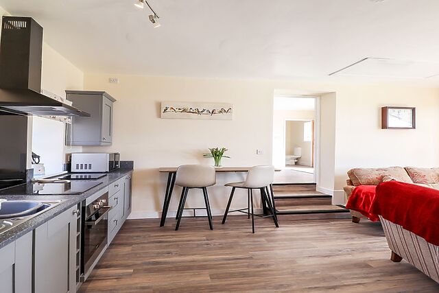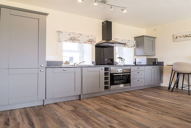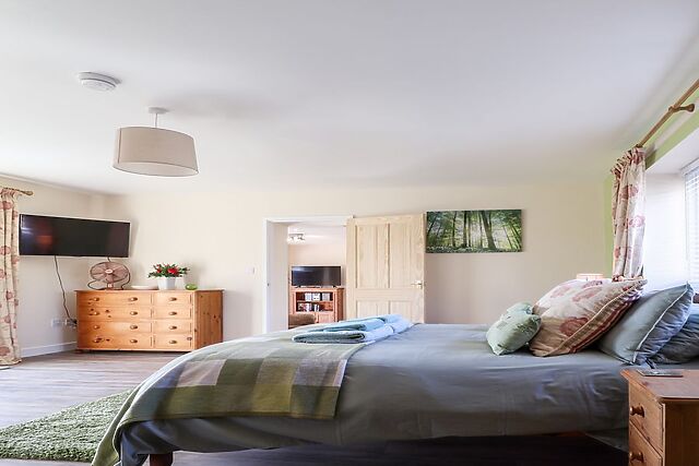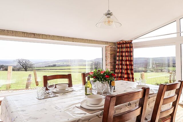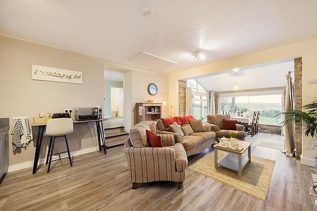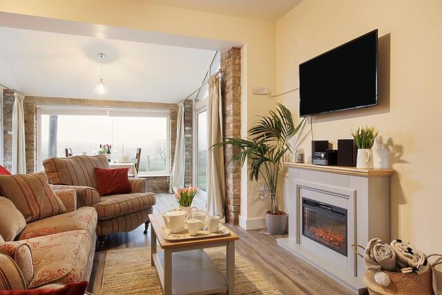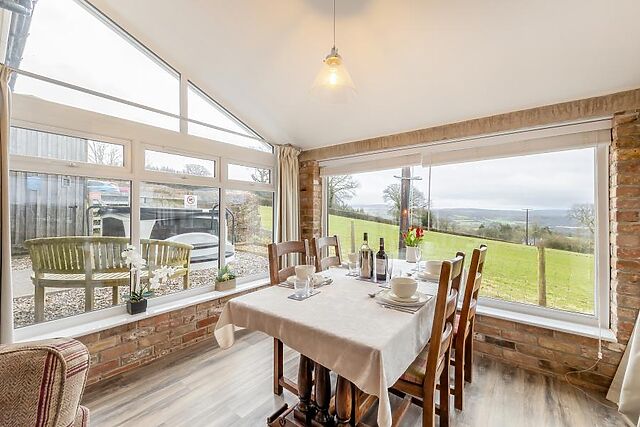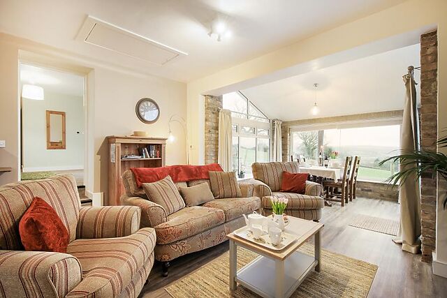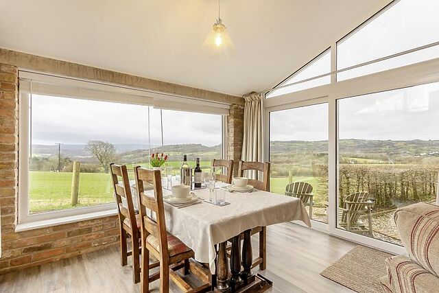 The living space includes a single-galley kitchen with everything the chef of the holiday will need to create delicious meals, including a dishwasher for convenience. Sip a morning coffee or sit and chat with the cook, while the dining-room extension features picture windows that frame the views of the rolling fields outside.