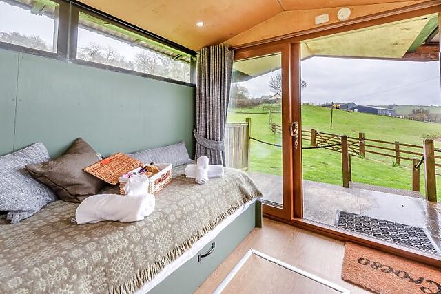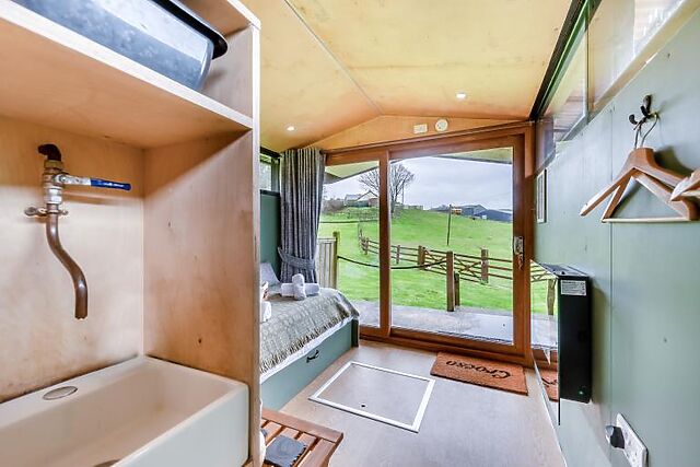 The cabin is set on a working farm in a Dark Sky zone, providing clear, unpolluted views of the night sky. The cosy interior includes a sofa that converts into a double bed, a compact kitchenette, and an en-suite shower room.
