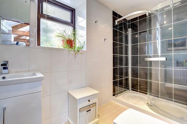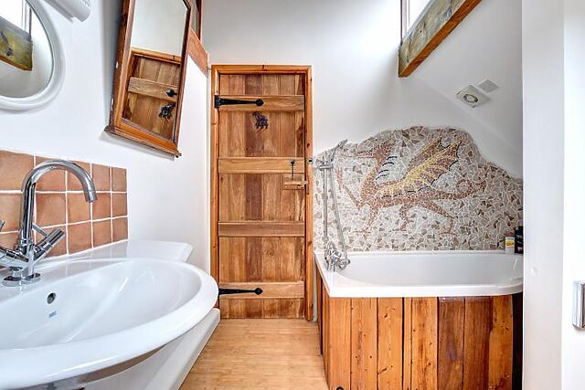 Upstairs The spacious upstairs en-suite bedroom has a king size bed and two single full-size futon beds for children. It has a walk-in wardrobe, dressing table and a beautiful bathroom with a hand-made Welsh Dragon mosaic and a shower over the bath.