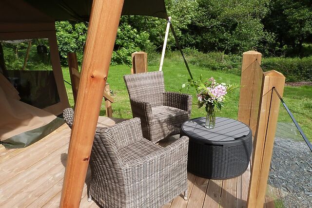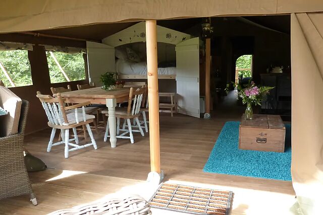 Once plates are clear, sink into the leather sofa and soak in the serene countryside views from the tent opening. Freshen up in the shower room with a separate basin and WC for convenience.