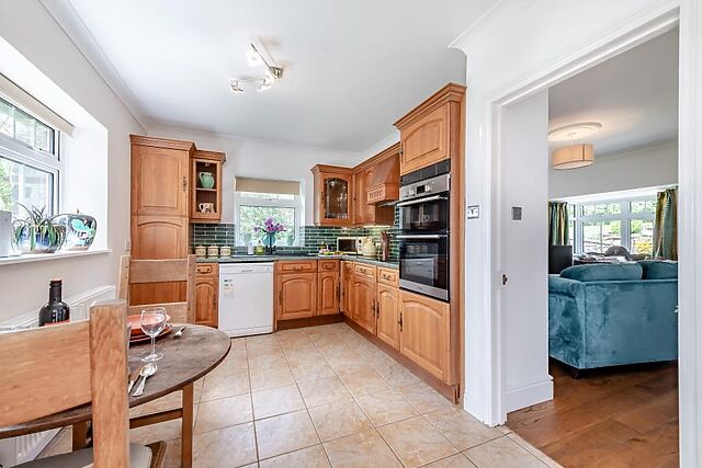 With warm wooden cabinets and colourful tiles, the kitchen is a delight to prepare everything from lazy breakfasts to hearty home-cooked meals. Dine in or out with a breakfast table here and a bistro table and chairs on the raised terrace.