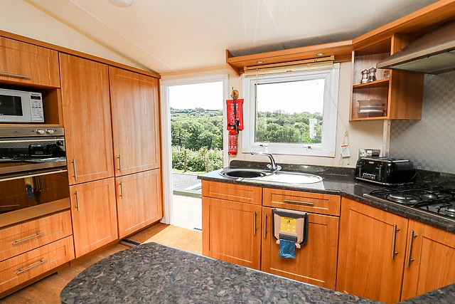 The Lodge boasts a spacious open-plan living area with an electric fire, where you can relax on the plush sofa and enjoy your favourite shows.