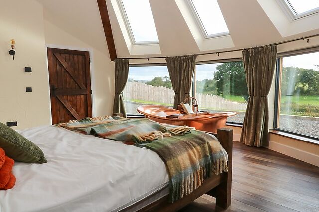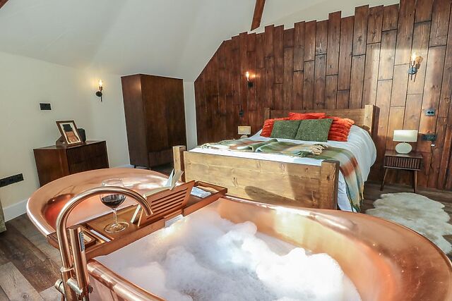 A huge copper bathtub sits in front of the window, perfectly placed to enjoy the view while you soak. Velux skylights above, complete with black-out blinds, bring in natural light by day and reveal the stars at night.