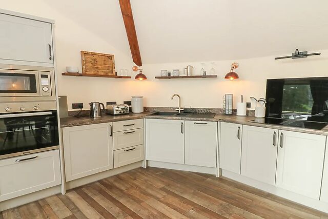 Crwn, the countryside opens up around you, a peaceful patchwork of meadows and rolling hills that immediately sets the tone for your stay. The gravel crunches underfoot as you step out, and a neat patio leads you to the front door.