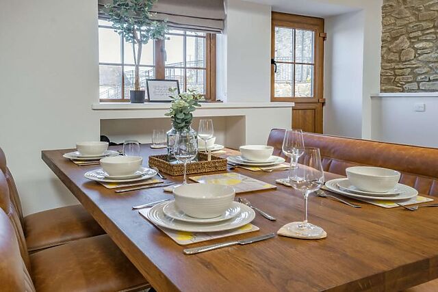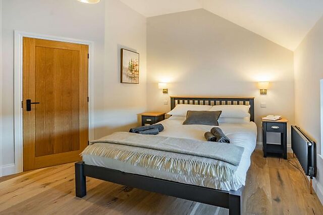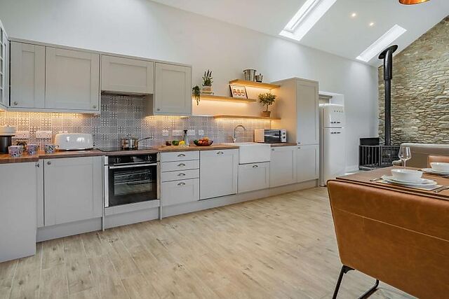The open-plan living and dining area, complete with a wood burner, provides a cosy atmosphere for evenings spent indoors. High-quality furnishings throughout ensure your stay is comfortable and stylish.