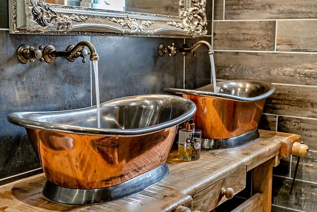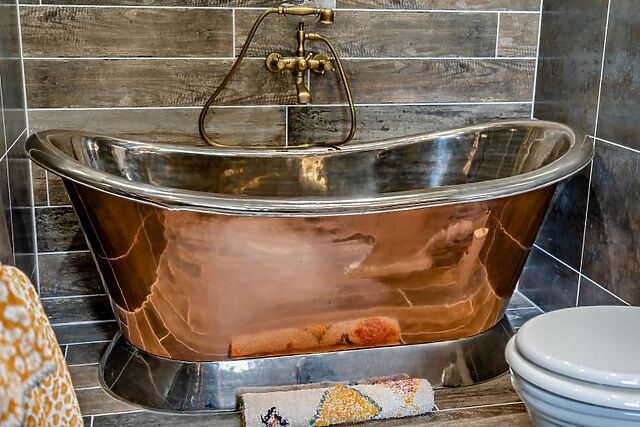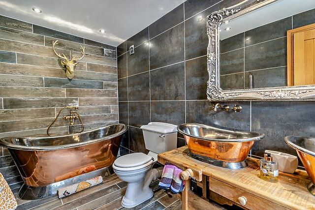 The Gothic-style family bathroom boasts a luxurious free-standing bath, perfect for unwinding after a day of exploring.