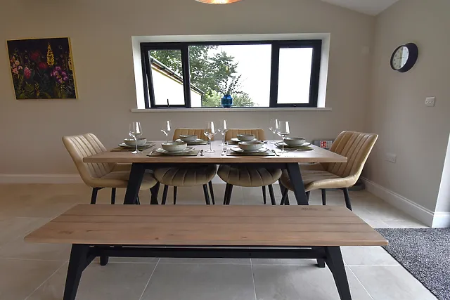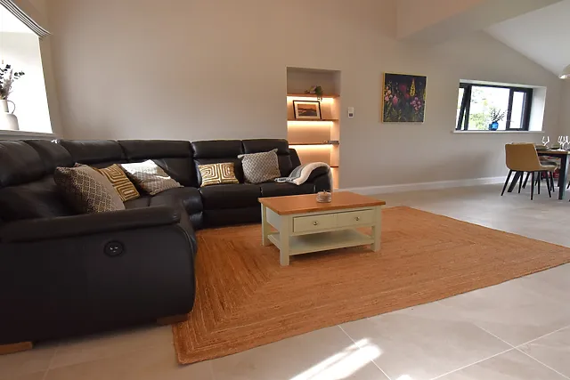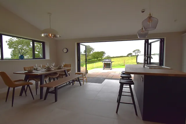 Step into the open-plan living space, where bi-fold doors reveal breathtaking views. A wood burner provides a cosy atmosphere for relaxing evenings.