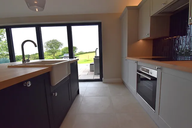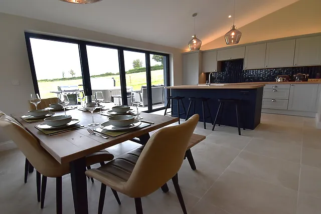 Step into the open-plan living space, where bi-fold doors reveal breathtaking views. A wood burner provides a cosy atmosphere for relaxing evenings. The well-equipped kitchen and dining area are ideal for family meals.