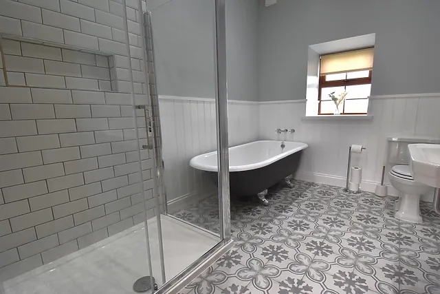 The contemporary family bathroom adds a touch of indulgence with its roll-top bath and walk-in shower.