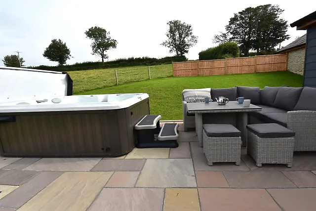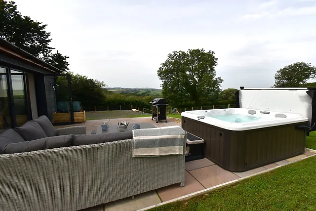 Yes, the property features a luxurious hot tub on the patio terrace, offering guests uninterrupted views of the beautiful Welsh countryside.