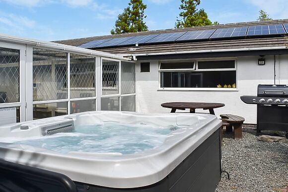 Detached 4-bed bungalow in Llanilar, Ceredigion, sleeping 8. Private indoor heated pool, hot tub for 6, enclosed garden with BBQ and 3 miles from the coast. Pets stay free. All on one floor. Celebration friendly.