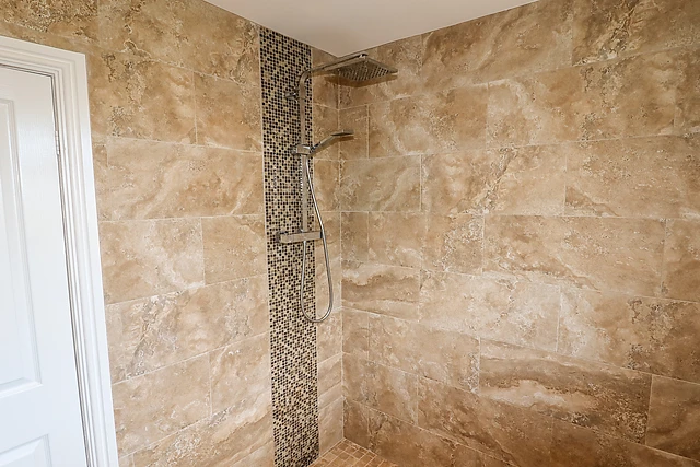 The first of the bedroom’s rests on the ground floor, offering a double bed with storage. Here there is also a contemporary wet room with tasteful tiles and rainfall shower.