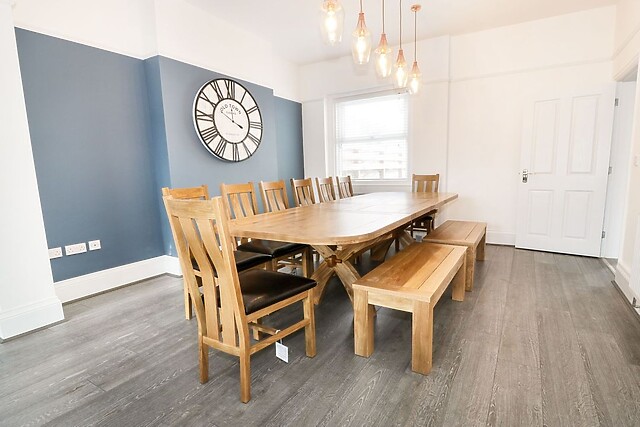 Upon entering the property, you'll be greeted by a spacious kitchen, fully equipped to cater to your culinary needs throughout your stay. Adjacent to the kitchen, you'll find a grand dining room, boasting seating for up to 14 people, perfect for hosting memorable meals with your loved ones.