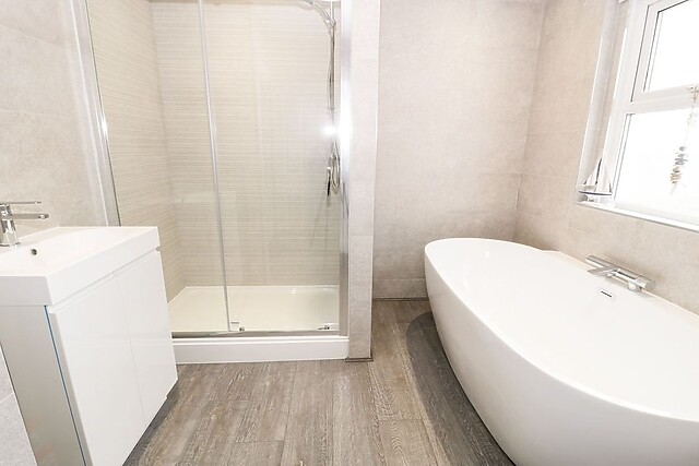 The second-floor houses two twin rooms, which can be converted into king-size beds upon request, offering flexible sleeping arrangements to suit your group. Two sleek bathrooms, each featuring a freestanding bath, walk-in shower, basin, and WC, serve the bedrooms, providing ample space for everyone to prepare for the day ahead.