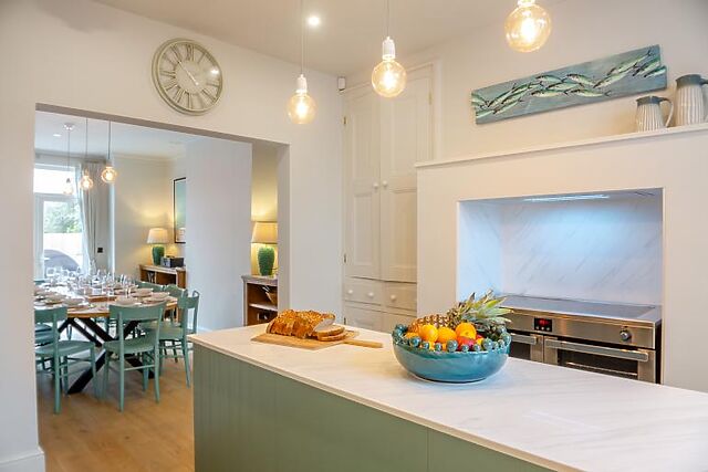 Inside, you'll find two sumptuous lounges, each with a Smart TV and a wood burner, perfect for cosy evenings. The bright and spacious kitchen is a culinary haven, equipped with stylish counters, a wine cooler, and a Nespresso coffee machine. The chic dining table comfortably seats 14 guests, making it ideal for group meals.