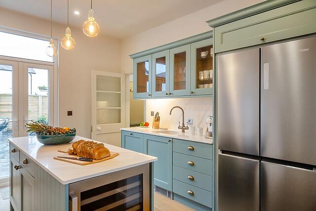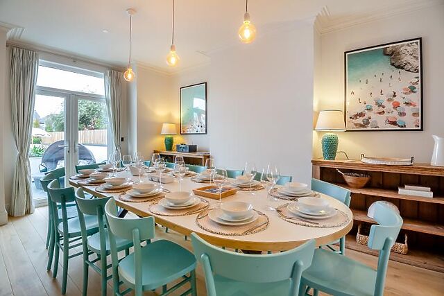 The bright and spacious kitchen is a culinary haven, equipped with stylish counters, a wine cooler, and a Nespresso coffee machine. The chic dining table comfortably seats 14 guests, making it ideal for group meals.