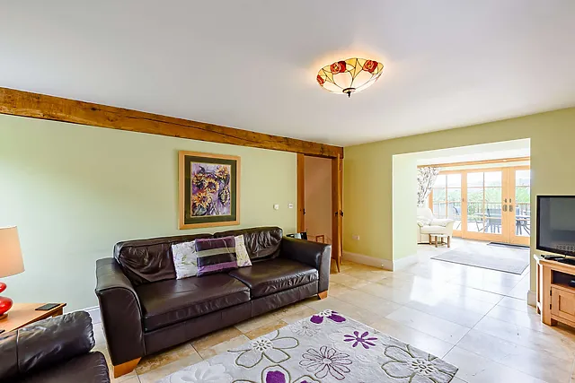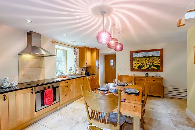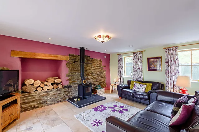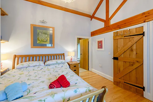 The accommodation features high ceilings, exposed beams, and a wood burner, adding to the cosy atmosphere. The enclosed garden ensures privacy and a safe space for pets, making it an ideal choice for both families and couples.