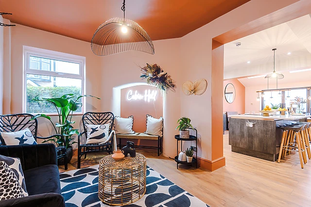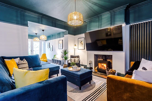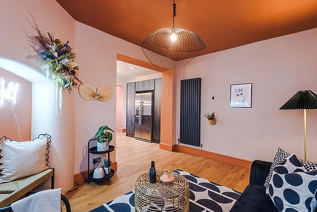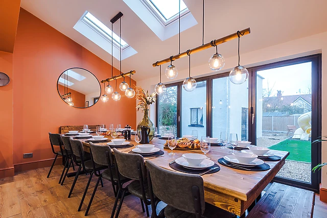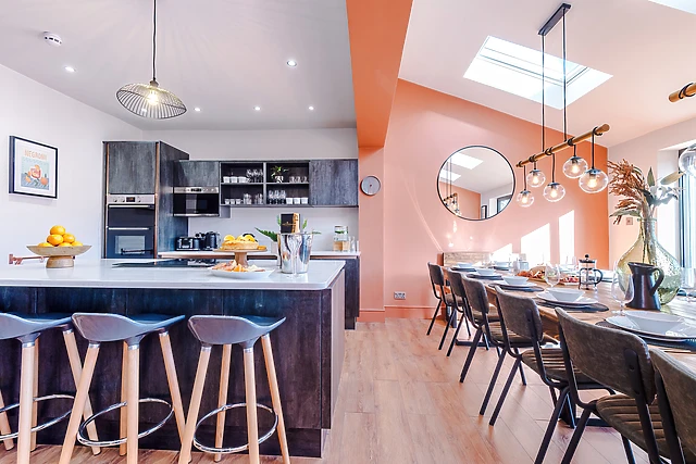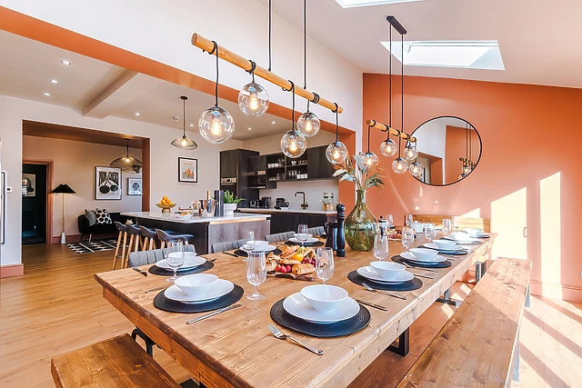 The open-plan living area, complete with a well-equipped kitchen and cosy sitting area, is the heart of the home, while a separate dining room seats 18 for grand dinner parties.