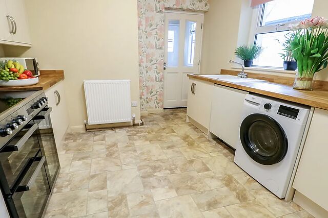 This is the perfect spot to toast your holiday plans before heading out to discover the town. Continue into the kitchen, where tiled floors and wooden countertops combine practicality with style.