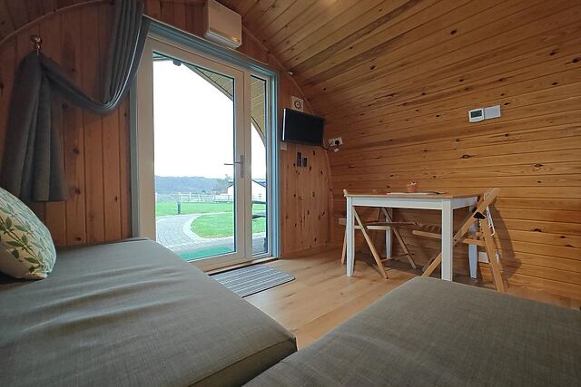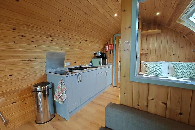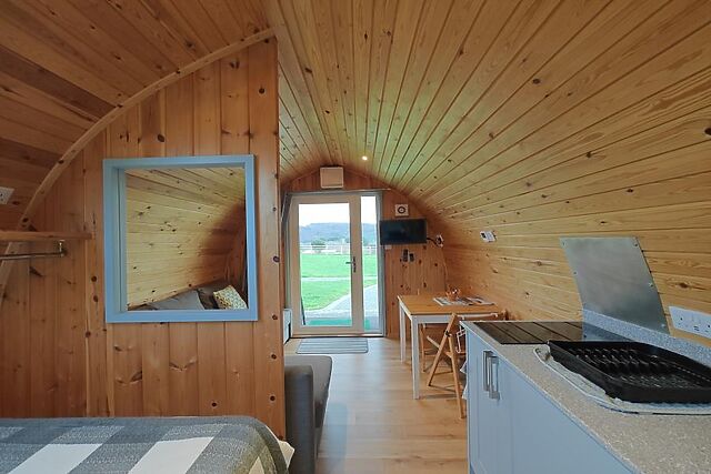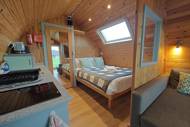 On the southern side of the estuary, discover Conwy Morfa Beach (5.5 miles), a sandy expanse perfect for searching for sea glass and admiring views towards Puffin Island and Conwy Bay. The wooden contours of this traditional-style pod enhance its cosy, atmospheric feel, while thoughtful updates ensure the space is modern and comfortable.