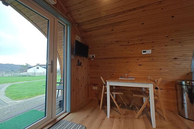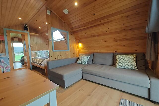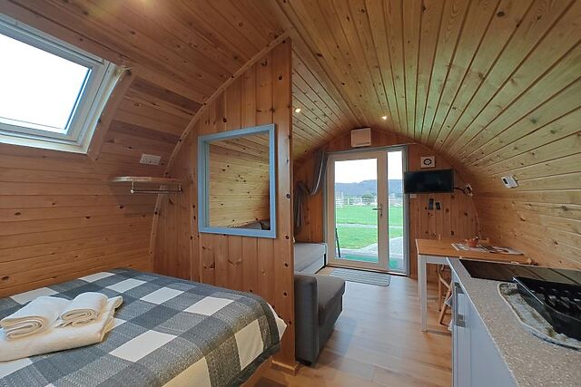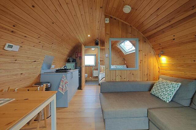 A little further afield, visit Llandudno (8 miles) or Colwyn Bay (8.5 miles), classic coastal resorts offering beaches and plenty of seaside appeal. The curved wooden panelling of this studio-style pod lends it a cosy, welcoming feel, while underfloor heating provides warmth underfoot.