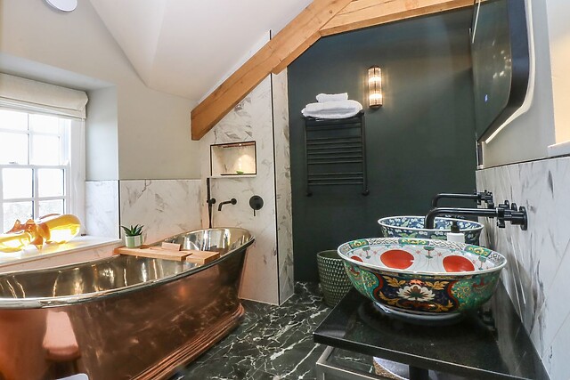 The luxurious bathroom and shower room both have underfloor heating, with a quirky copper slipper bath and dual washbasins from the London Basin Company, perfect for indulgent moments of relaxation. The view from the bath, down the estuary to the hills beyond, is the best in the cottage.
