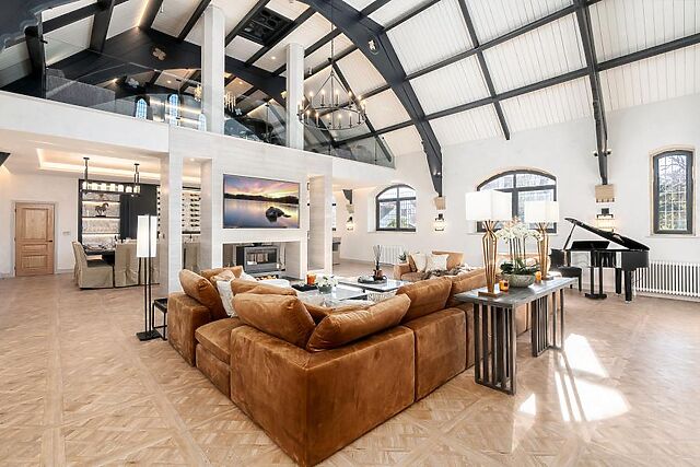 An opulent dining room seats all 34 guests around a huge table beneath feature lighting, while the adjoining lounge has vaulted ceilings, a baby grand piano, a Smart TV with Dolby Atmos sound and direct access to the gardens. The high-spec kitchen, complete with two breakfast bars and plentiful appliances, is a dream for chefs.