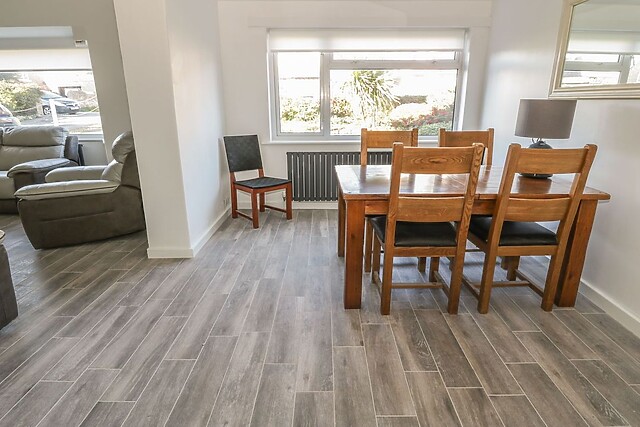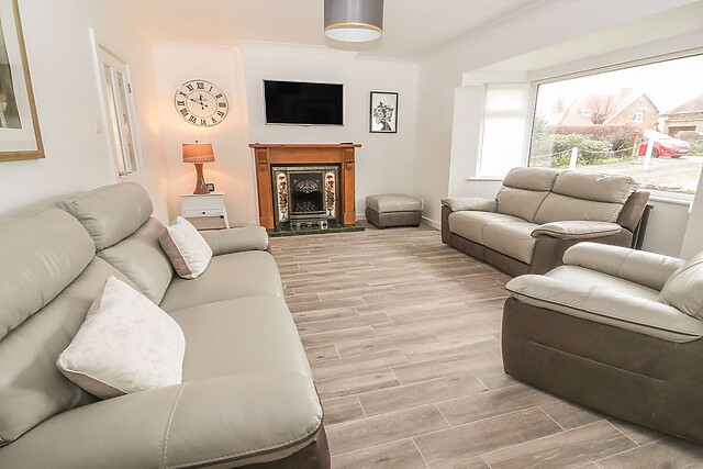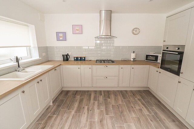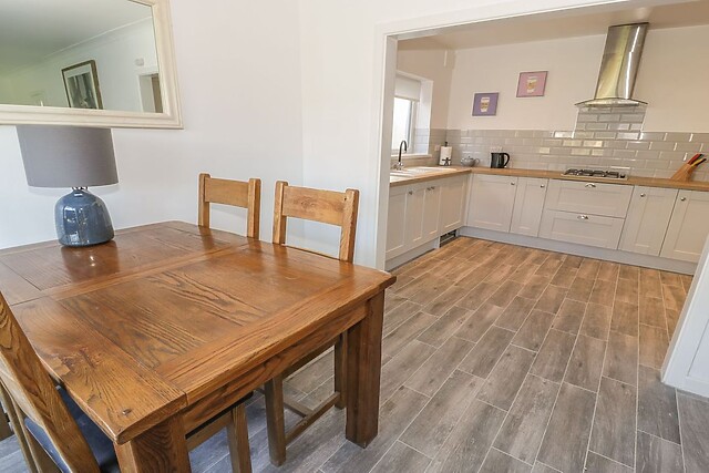 An open archway reveals the lounge, which is centred by a gas fire, with a bay window overlooking the garden, and reclining sofas including USB charging ports, where you can appreciate it all from. The lovely dining room lies adjacent for four people, and the modernised kitchen is equipped with everything you need for a comfortable stay.