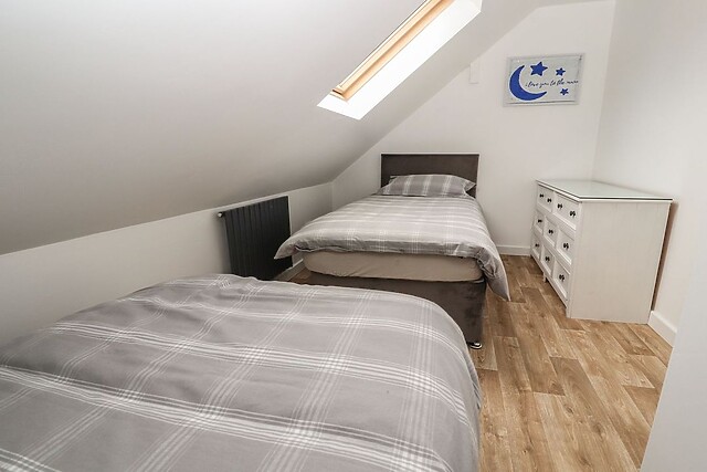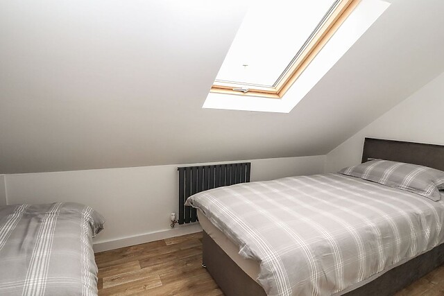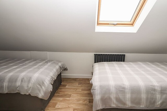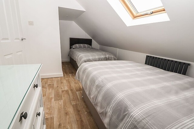 Upstairs, three bedrooms await, the twin room is tucked away beneath sloping ceilings, with a Velux window above, and a super king-size room is elevated by views of the garden, a full-height mirror, and a built in wardrobe. A double room benefits from furniture, including a dresser and wardrobe, each as pleasantly designed as the next.