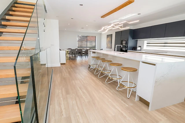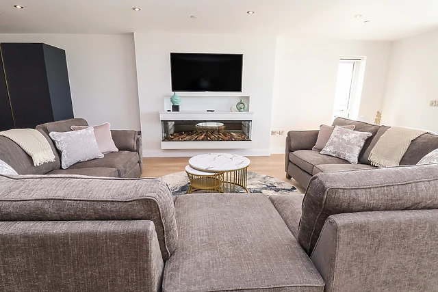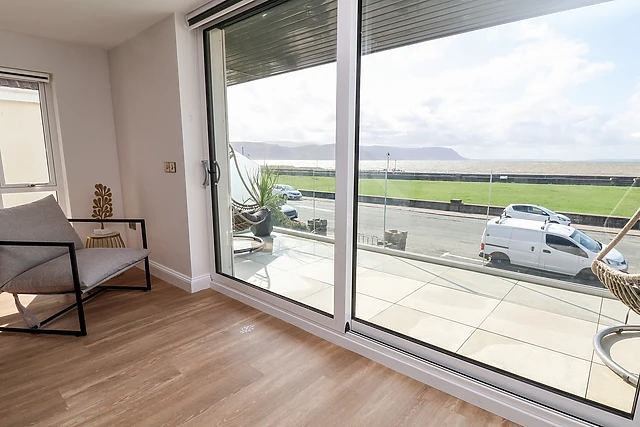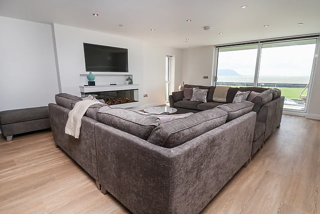Travelling to the first floor, you will find a light and airy open-plan living space, an opulent space for guests to socialise and enjoy a hearty meal, cooked up in the amply-fitted kitchen, where care has been taken to create a contemporary space with stylish furniture. Recline in the sitting area beside the gas fire and reflect on your day or enjoy a morning coffee on the balcony with a view across the beach and to the ocean beyond; also, on this floor there is a handy cloakroom.